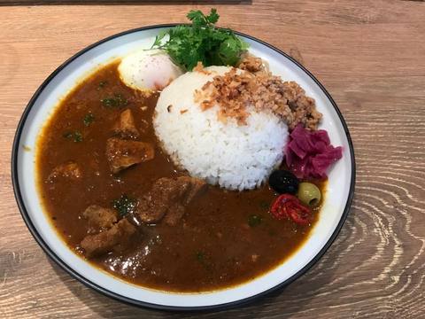 スパイシーでフルーティー、複雑な味が調和した特別なチキンカレー。